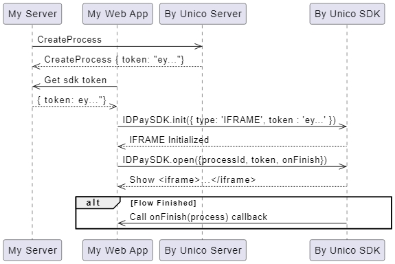 ByUnicoSDK.close();The sequence diagram below demonstrates how to use the SDK and the API result from by Unico to configure the iFrame: